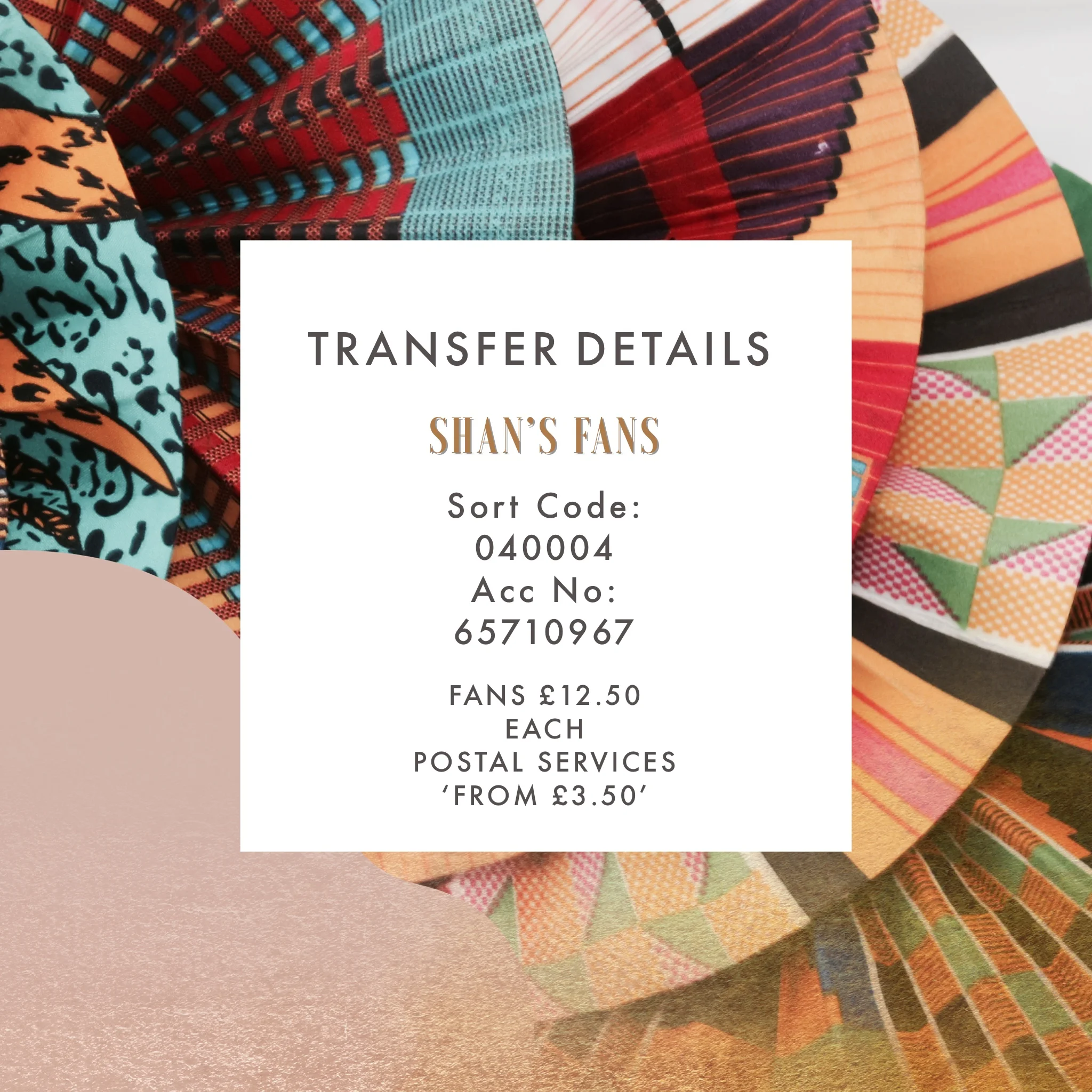 Please make your payment and complete the form below. If you submit your form without payment your order will not be processed. Please ensure to enter the style of Fan you are purchasing to ensure the right one is posted to you. All fields are required and are used to keep you up to date with your orders. When making your payments please Ref with your name, a receipt will be sent to you once payment has been made.